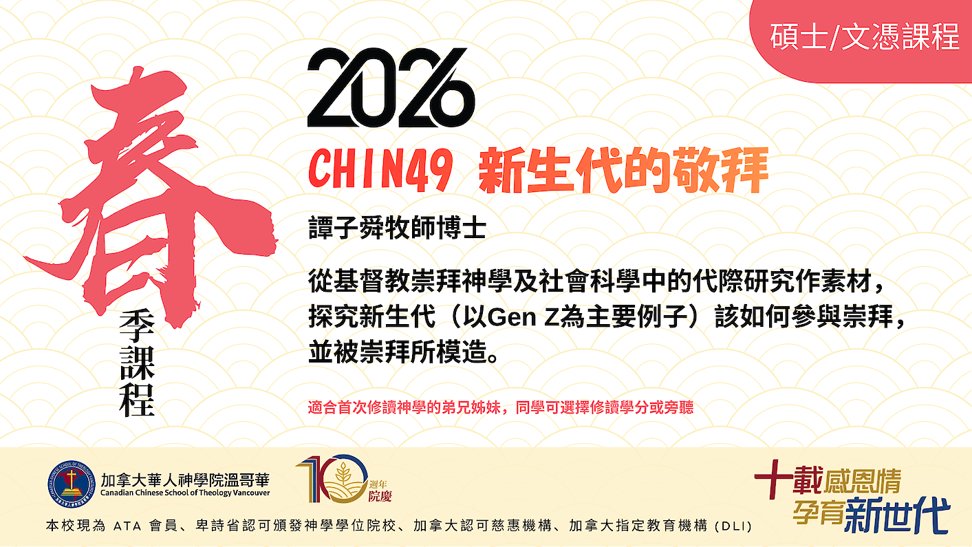 不論修讀學分或旁聽的名額皆有限,如有興趣請盡快電郵至info@ccstvan.ca聯絡同工。