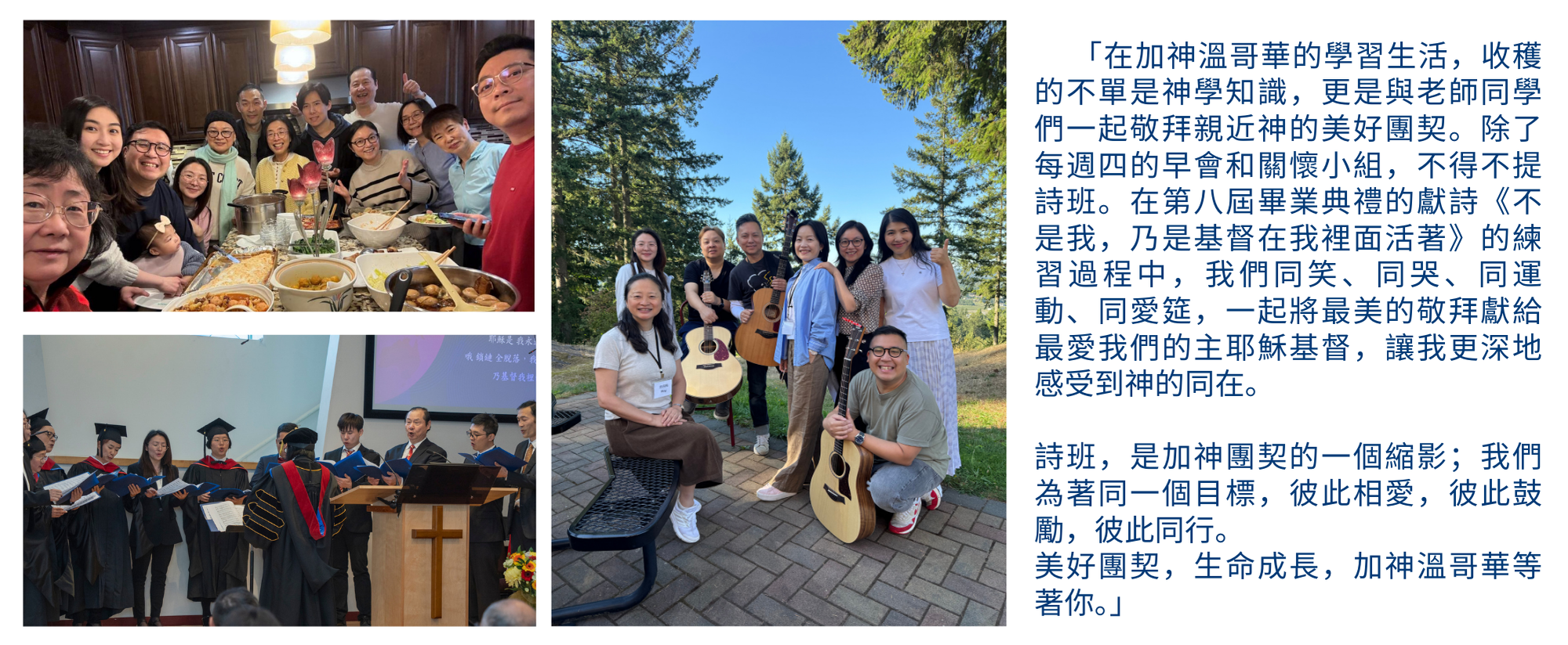 在群體生活方面,學院舉辦多姿多采的活動,例如年度學生退修營,讓學生、配偶及教職員同工一同學習、分享與禱告,同時歡迎新生加入屬靈大家庭。學生亦透過各種服侍機會與本地教會及機構連結,累積實踐經驗。畢業後,加神溫哥華校友會持續連結畢業生,成為彼此守望與資源共享的平台。請聽聽道學碩士同學雷海麗有關群體生活的分享: