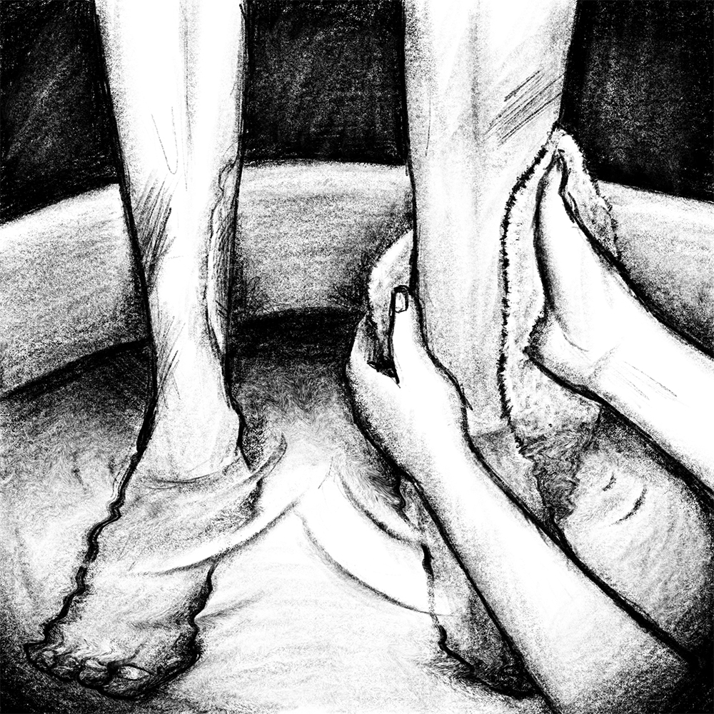 畫中左邊的腳有一大片傷口,是源於我有次在街上看見一個瘦削的男人的腳有一處見到肉的傷口。這畫面令我難以忘懷。耶穌傳道時醫治病人,他其中一個方式是「觸摸」。我將之結合洗腳的動作。洗腳,同時帶來憐憫的醫治。