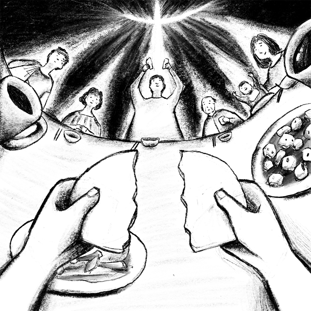 這是源自我在新約導論課程的其中一個報告題目——「餐桌團契」。 「飲食」在基督教是其中一個很重要的主題。耶穌透過「餐桌團契」或者「主餐」去呈現出天國的樣式。耶穌在筳席中沒有排除那些被法利賽人拒絕的人——「稅吏和罪人」,而是與他們建立關係。 猶太人在同一張枱用飯,代表群體的彼此接納,關係的維繫。在教會裏面我們雖然沒有血緣關係,身分、階層、地位不同,但每一次的主餐都是提醒坐席的人:「我們都在基督裡成為一家人」。 這幅畫結合了第一人稱和第三人稱角度。眼前的中式餐桌,一個擘餅的動作。中國所謂「民以食為天」,天國的子民也是「食」作為天國的呈現。同桌吃飯除了人,還有基督的身體,成為我們關係的連結。在飯桌上大家都是平等相待,同得飽足。