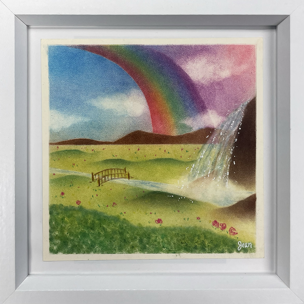彩虹橫跨於瀑布上空,象徵着神的應許與信實。瀑布的流水不斷傾瀉,就如同上帝的恩典,源源不絕地澆灌大地。綠意盎然的草原與小橋,帶來安穩與歸屬感,像是提醒我們在大自然的美景中,也能遇見上帝的同在。